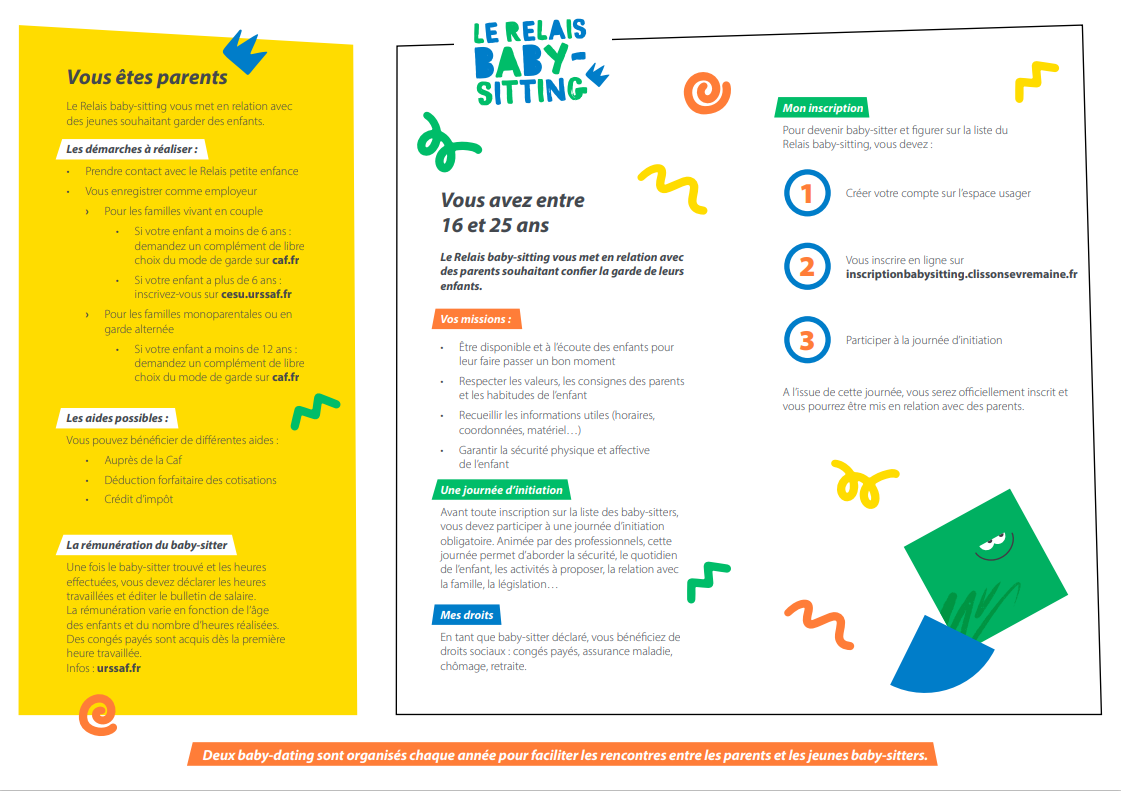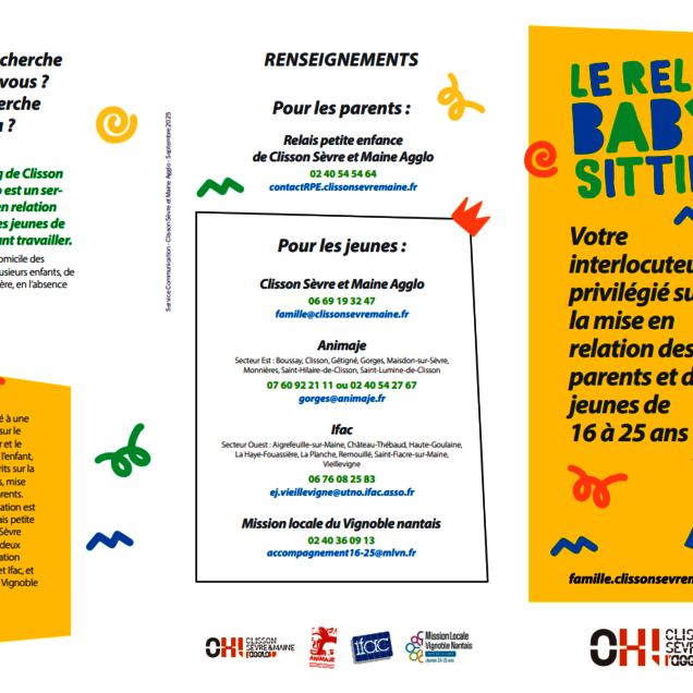 Le Relais Baby-sitting de Clisson, Sèvre et Maine Agglo est un service gratuit de mise en relation des parents qui souhaitent employer un(e) baby-sitter et de jeunes de 16 à 25 ans qui souhaitent faire du baby-sitting.